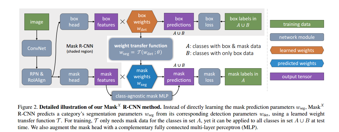 为了解决这个部分监督的问题,作者提出一个基于Mask R-CNN的新的迁移学习方法。(关于Mask R-CNN,后面我会补上这一篇论文的解读。)Mask R-CNN非常合适用于解决这个问题,因为它将实例分割问题分解为两个子任务:目标检测和mask预测。所以,通过学习一个从目标检测参数到实例分割的迁移函数来解决上述问题,所以在测试阶段,实例分割的参数并不是通过训练期间学习到的,而是通过迁移函数预测得到的。
