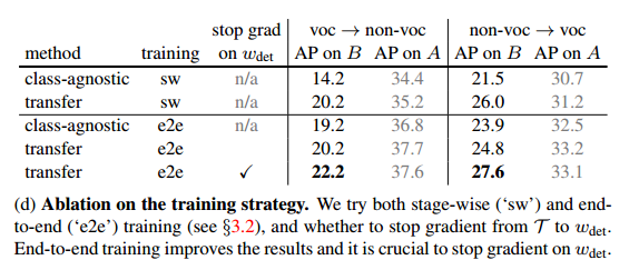 Effect of end-to-end training 以上a,b,c的实验都是用两阶段训练法得到的结果,然后作者对比了end-to-end的训练方法的效果。从d可以看到,只有当停止T对Wdet的梯度传播才能带来效果的提升。