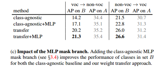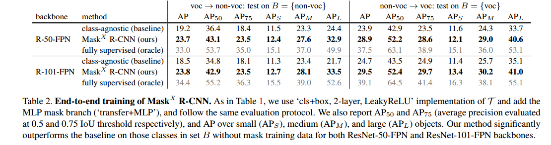 Baseline and oracle本文的baseline是Mask RCNN,起中mask head是一个FCN,并且这个Mask RCNN的Wseg是类别无关的,也即使不管什么类别,Wseg都是相同的。而本文还用了一个Oracle(神级模型)来做对比,这个模型用了COCO所有的mask数据集来训练,所以,基本上是本文提出的方法的上限。