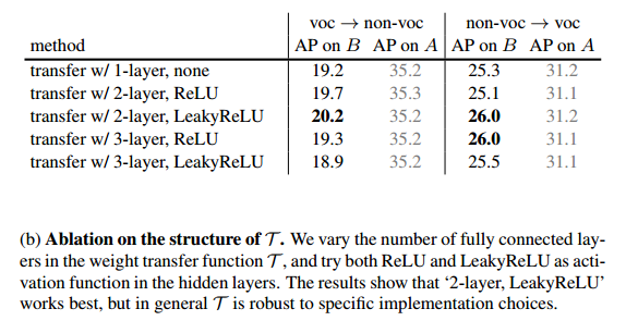 Structure of T 这部分比较了T函数去什么形式的性能。做了两种实验,1是简单的仿射变黄,2是一个2到3层的MLP。同时作者还测试了ReLU和LeakyReLU。结果表明2层的MLP+LeakyReLU效果最佳。