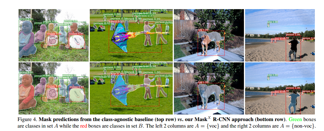 然后下图展示了一些结果,上一行的baseline,下一行是Mask* RCNN。