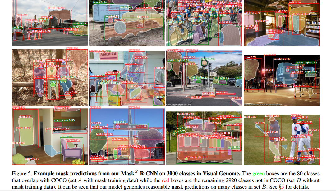 2.第二部分实验,作者还用上了VG数据集,VG数据集包含大量的boxes信息,但是没有分割标注,并且很多类别是同义词,作者选择了其中出现频率最大的3000类来进行大规模的实验。由于整数据及缺少分割标注信息,所以很难量化的评估模型的效果。
