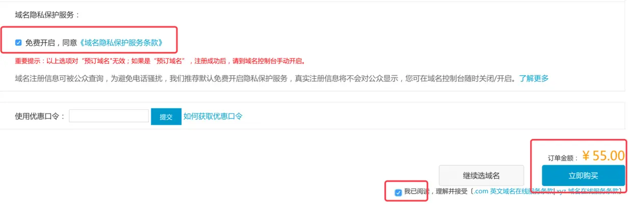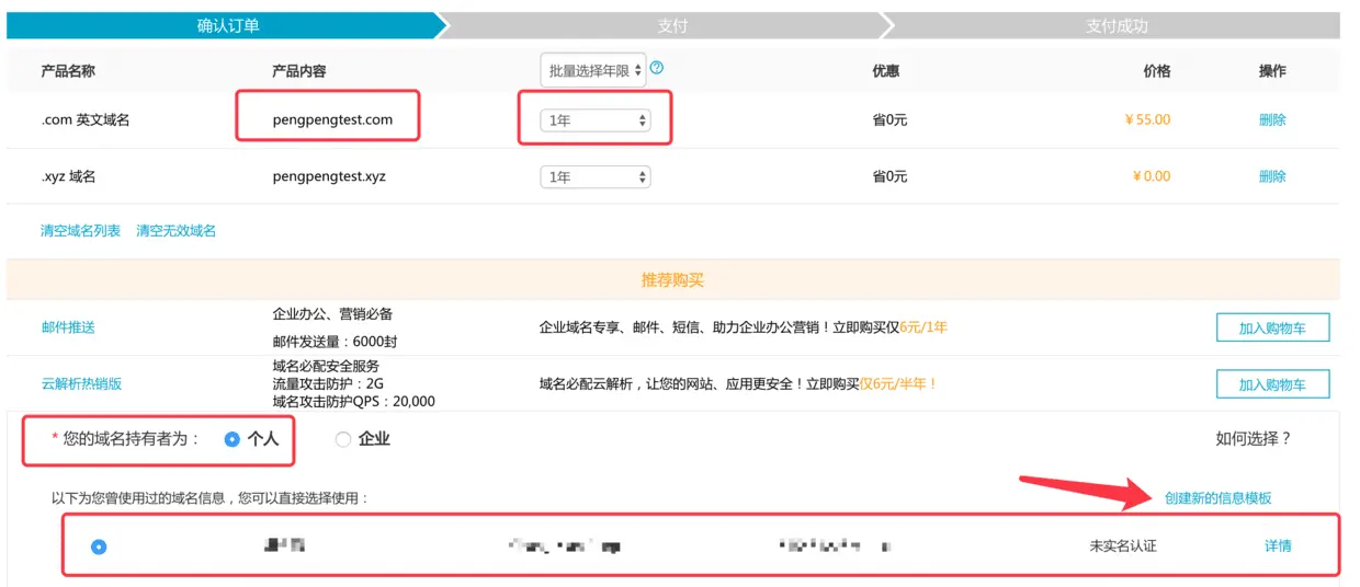 3.确定域名, 年限, 持有者为个人, 创建信息模板. 立即购买.