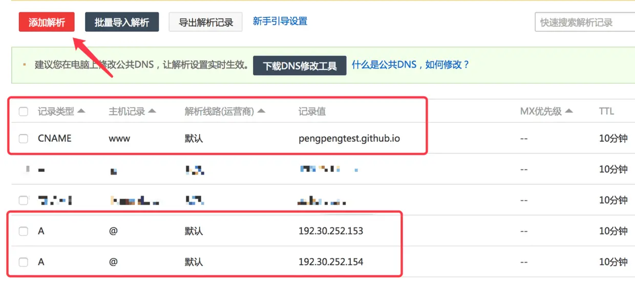 2.添加3条解析记录.初次解析可能会有点慢.