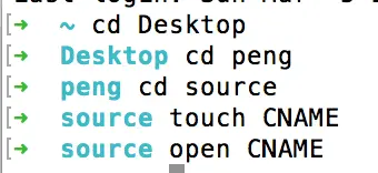 1.先进入桌面, cd 你的hexo本地目录, cd source, touch CNAME创建CNAME文件, open CNAME打开并编辑.