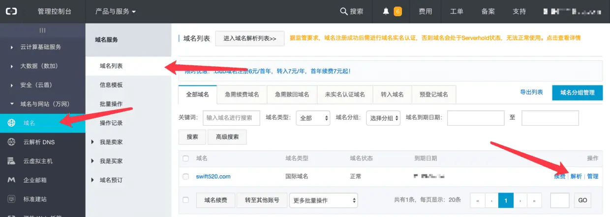 1.点击域名, 域名列表, 找到域名进行解析.