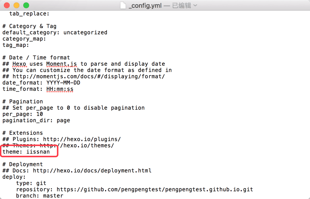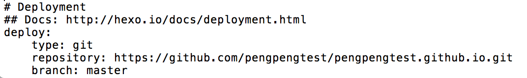 7.在终端输入open _config.yml, 打开hexo配置文件, 滑动到最下面, 找到deploy, repository和branch这两个默认没有, 你按我的格式粘贴既可.