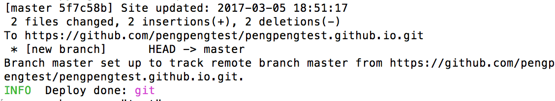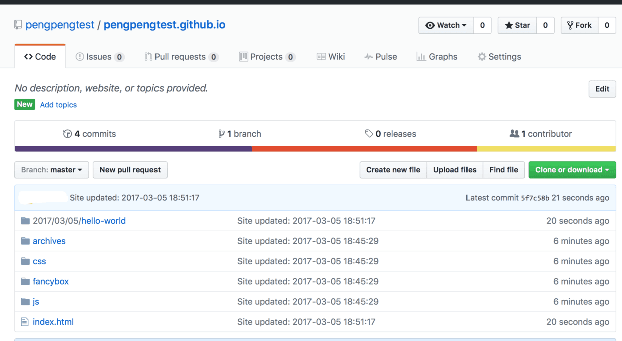 9.出现下图,表示部署博客到github仓库成功.打开github仓库, 里面已经有了文件了.