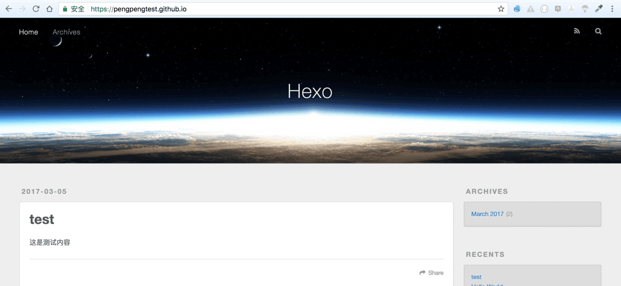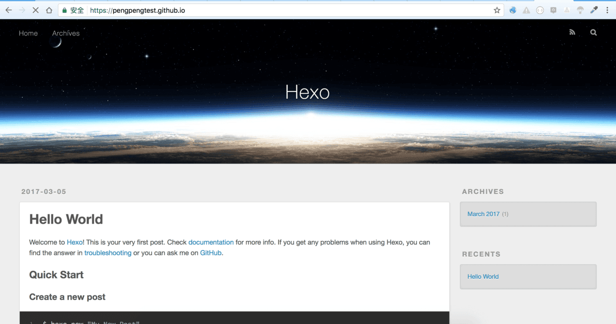 2.分别输入hexo g(生成)和hexo d(部署)后, 或者直接hexo g -d后, 再打开你的用户名.github.io. 新的文章也发布成功了.(有时候可能需要清除一下浏览器缓存才行)