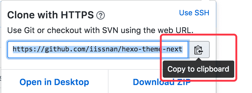 2.在这里, 我们用iissnan/hexo-theme-next主题来演示.首先进入你想用的主题github仓库, 拷贝仓库地址.