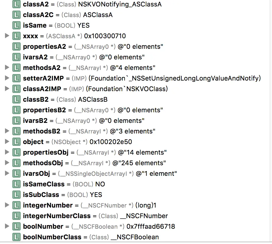 ③ 方法列表:NSKVONotifying_ASClassA 出现了四个新的方法,