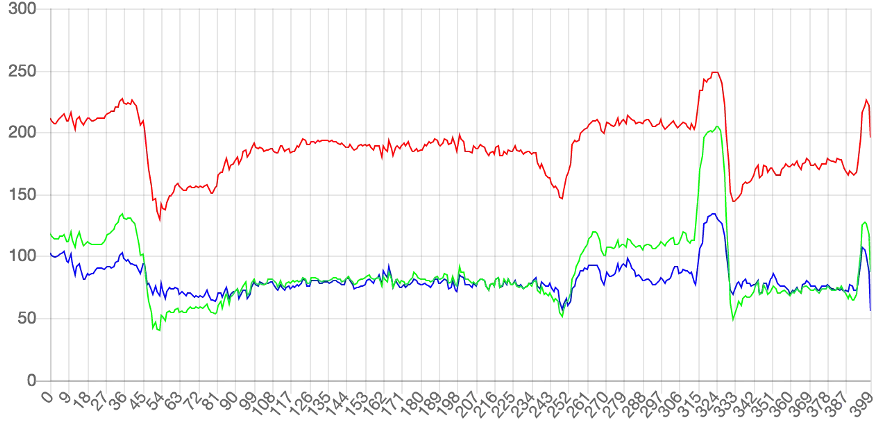 如果把每一行所有像素(上例是400个)的红、绿、蓝的值,依次画成三条曲线,就得到了下面的图形。