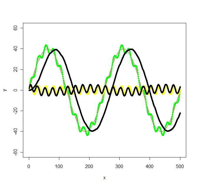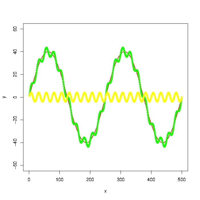 上图有三根曲线,黄线是高频波动,红线是低频波动。它们可以合成为一根曲线,就是绿线。