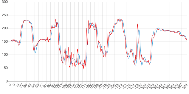 上图中,红线是原始的色彩曲线,蓝线是低通滤波后的曲线。