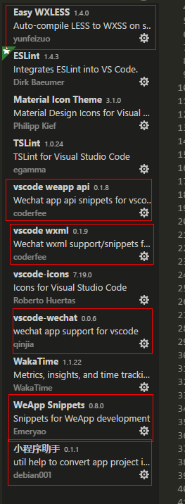 3.打开vscode,搜索下图中的插件安装。其中有一个插件是可以生成一个wx.d.ts的语法文件的,由于枝枝装插件的时候是全部一起装的,没有留意是哪个,不过个人感觉是小程序助手。