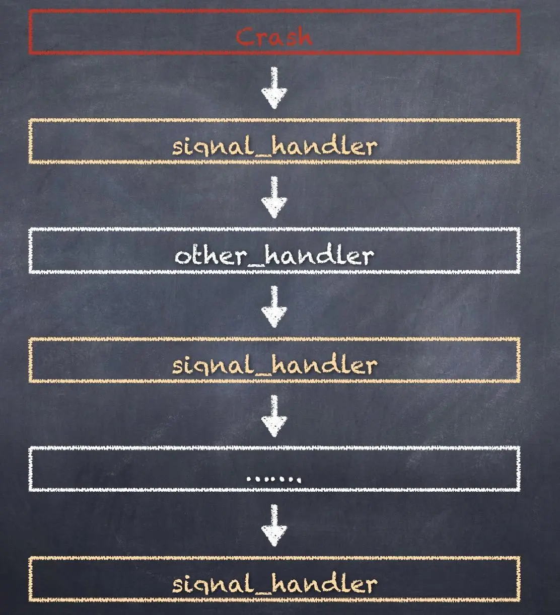在检测时发现当前回调是other,于是重新注册我们的回调,保存other。但是假如other也保存了我们的回调,这样可能会导致崩溃发生的时候,调用顺序变成一个死循环。