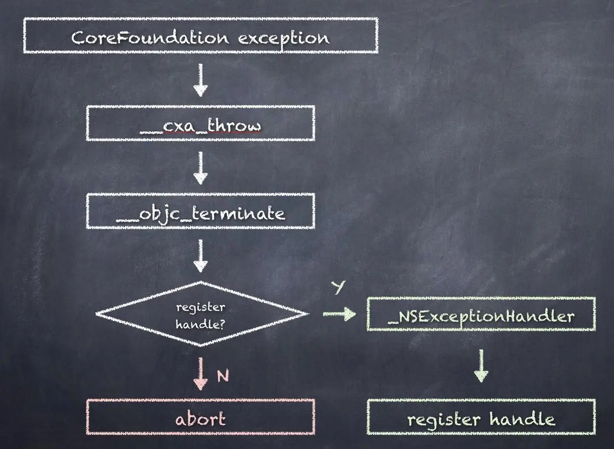NSExceptionNSException发生在CoreFoundation以及更高抽象层,在CoreFoundation层操作发生异常时,会通过__cxa_throw函数抛出异常。在通过NSSetUncaughtExceptionHandler注册NSException的捕获函数之后,崩溃发生时会调用这个捕获函数。但如果没有任何函数去捕获这个异常如果在捕获函数中没有进行操作终止应用,最终异常会通过abort()来抛出一个SIGABRT信号。由于