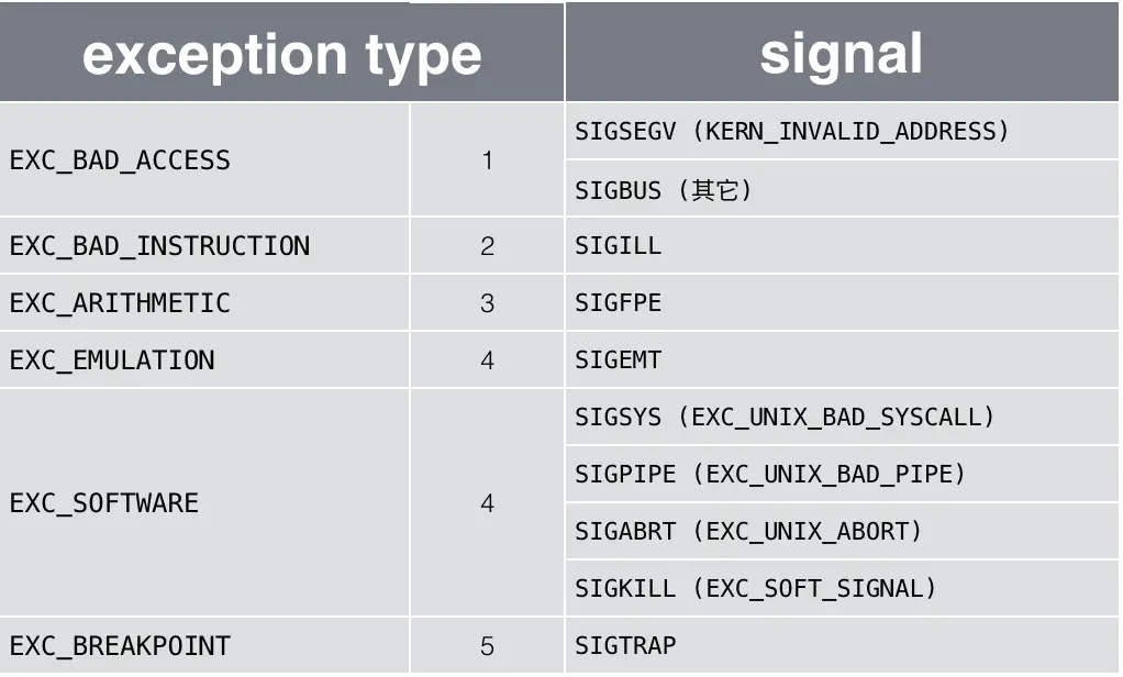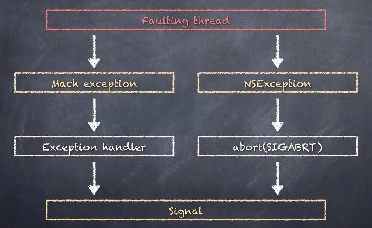 crash,但由于mach exception会在BSD层被转换成UNIX信号,NSException在未被捕获的情况下会调用abort抛出信号,因此即便是我们只注册了signal的处理,只要注册的signal足够多,理论上也是能捕获到全部的crash。