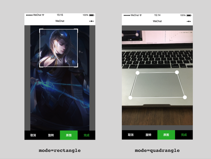 - mode:'quadrangle' 并不返回图片,只返回在图片中的四个点,用于perspective correction(可以查找OpenCV相关资料)