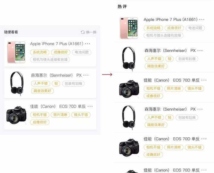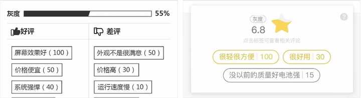 在最初产品经理的意思是把标签分为两类,并标上好、坏的的标识以及过长的好评度进度条。这种方式首先是笨拙的,设计度不高:进度条样式的展示比较适合多类对比(比如盖得排行),对于一种产品的话有更直接更精简的方式;再者对标签标上好坏的字样,是比较生硬低效的归类,应该让它本身的样式来让用户轻易区别其属性(比如你不能给好、坏人贴上标签);而正负面评价分开展示不利于排版优化。