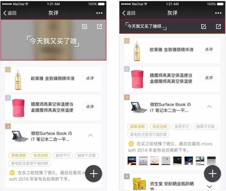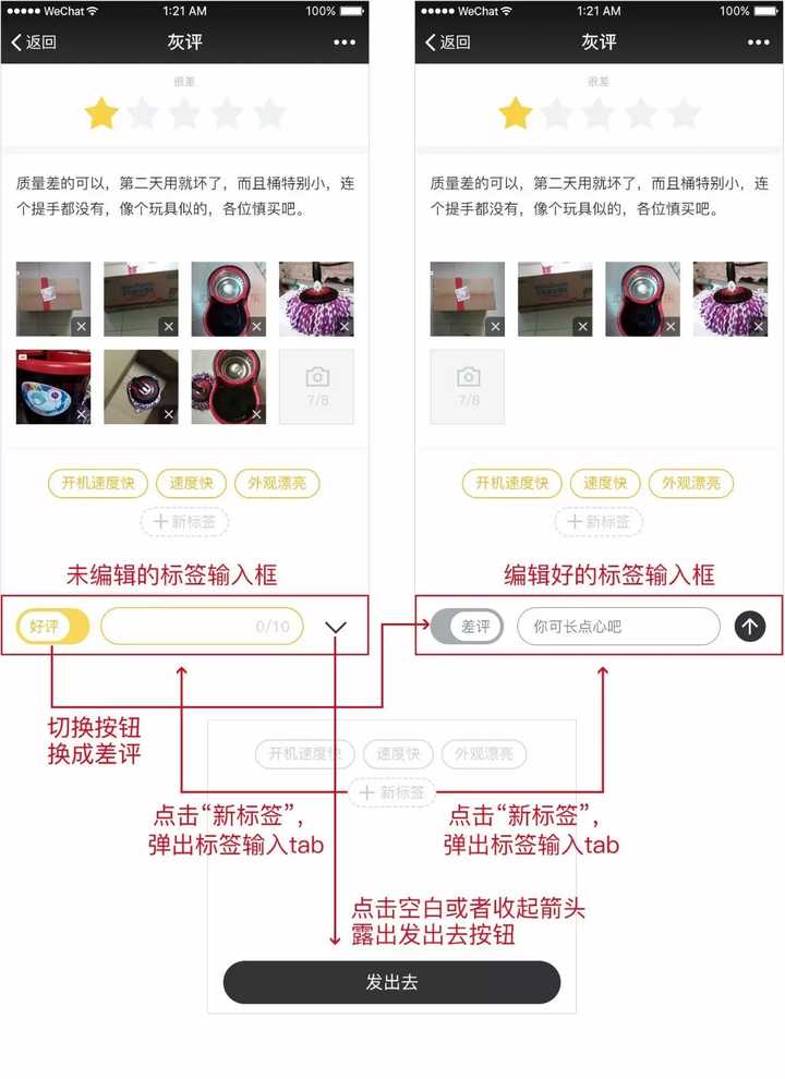 好坏差评的选择由复杂的图形设计变成了简单形状的开关形式,好坏标签的颜色+对应文字可直观的表现其属性;发出去按钮和收起icon由框内文字的有无来切换。优化后可以连续输入并看到当前的输入情况,减少每次写标签的繁琐过程和弹框的弹跳突兀感,整个流程也会更统一。