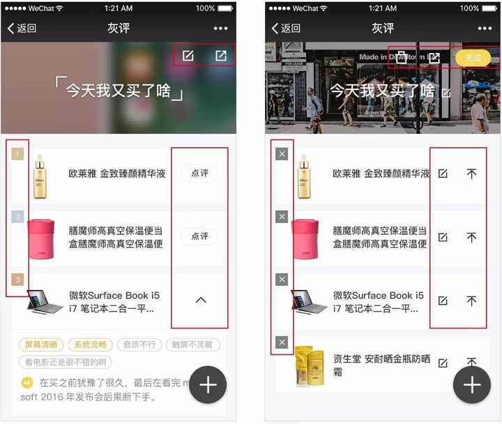 在清单详情页,编辑状态下有很多地方可以改变,并且不仅是单纯的删除。如果是在底部加个tab按钮来操作,一次很难编辑所有的需求,并且也会让页面变的厚重。而点击编辑后,商品的排名标识是不需要的,收起和点评也可以暂时搁置,所以变换商品删除操作是复用排名形式和位置,能感受到变化但不会有多少突兀感;列表中的编辑和置顶icon复用原来控件的位置并且保持大的间距以免误操作。