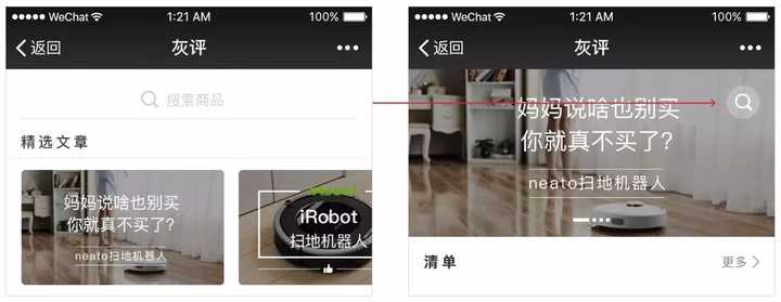 由于是新产品,数据量比较少,能搜索到的东西比较有限,所以搜索的功能是逐渐变弱的,尤其是当页面出现了文章、积分等内容后,搜索就要更要弱化显示。所以搜索由原来的的搜索框逐渐变成了一个右上角的icon。有搜索需求的时候可以找到,但是对平时的浏览不会有打扰。
