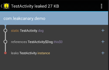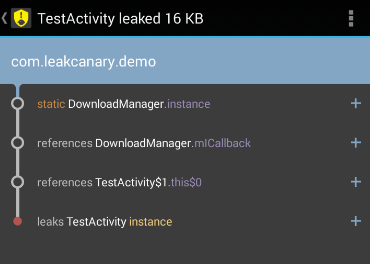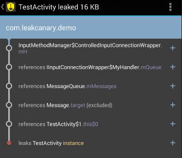 In com.leakcanary.demo:1.0:1.* com.less.demo.TestActivity has leaked: