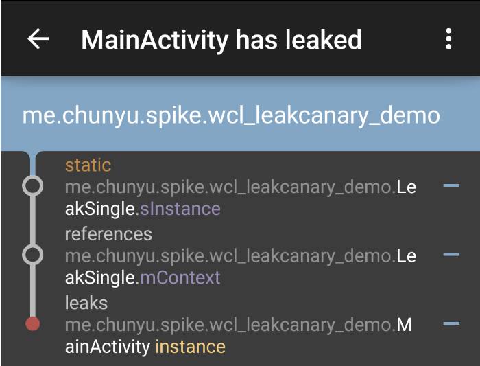 LeakCanary的内存泄露提示一般会包含三个部分:第一部分(LeakSingle类的sInstance变量)引用第二部分(LeakSingle类的mContext变量),导致第三部分(MainActivity类的实例instance)泄露.
