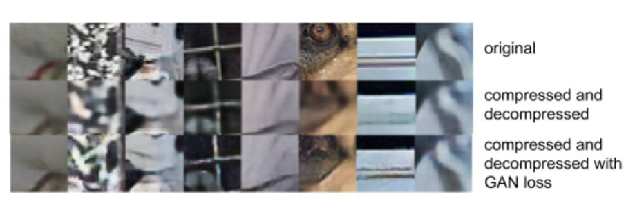 上图展示了对抗损失在图像压缩中的影响。最顶端一行图片来自 ImageNet 数据集。中间一行展示了用传统损失训练的图像压缩神经网络对图像进行压缩和解压缩的结果。底行图片展示了使用传统损失和对抗性损失训练的网络进行图像压缩的结果。使用 GAN 损失函数的图像更加清晰,包含更多细节,即使它可能会与原图像的差距更大。