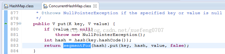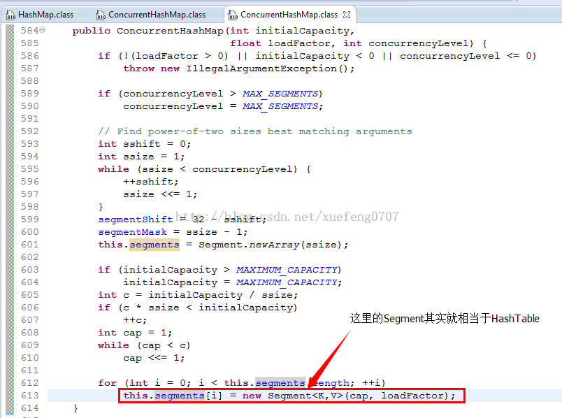 ConcurrentHashMap具体是怎么实现线程安全的呢,肯定不可能是每个方法加synchronized,那样就变成了HashTable。 从ConcurrentHashMap代码中可以看出,它引入了一个“分段锁”的概念,具体可以理解为把一个大的Map拆分成N个小的HashTable,根据key.hashCode()来决定把key放到哪个HashTable中。 在ConcurrentHashMap中,就是把Map分成了N个Segment,put和get的时候,都是现根据key.hashCode()算出放到哪个Segment中: