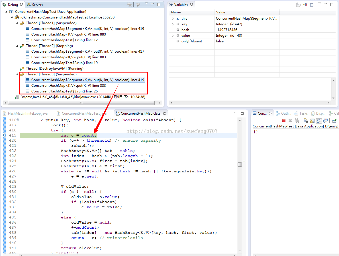 - 切换到Thread3,也走到Segment.put方法,因为7所存储的Segment和3、4不同,因此,不会阻塞在lock():