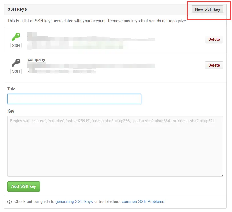 这里的Title随便填写,主要是为了方便管理密钥 然后把刚刚拷贝的内容粘贴到Key里面去 然后点击Add SSH key 到此,Github上面的SSH配置就完成了。