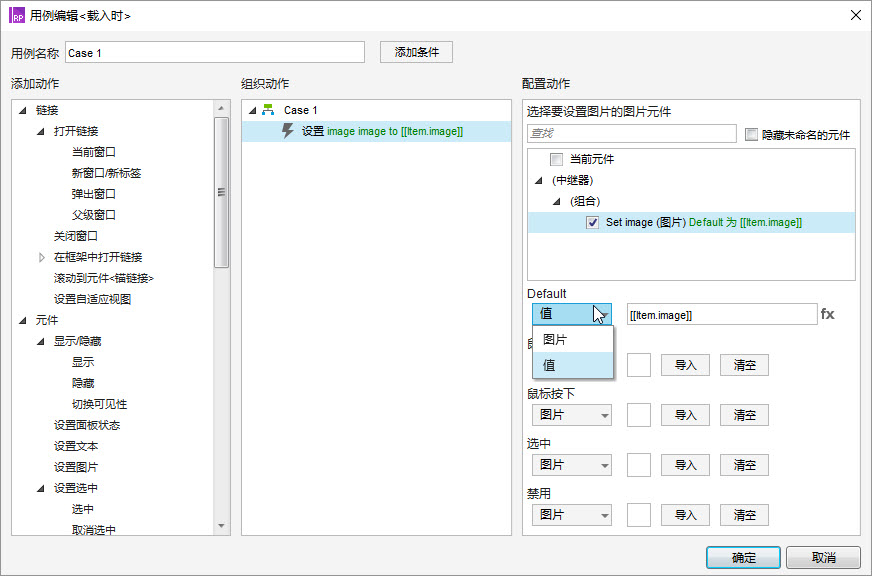 - 设置图片值的时候需要注意,点击default在下拉选项中选择值,然后设置对应的函数值;