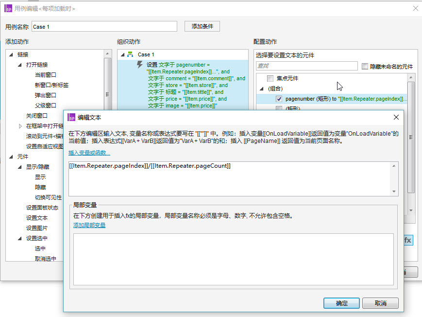 在页面上添加“页码”“上一页”和“下一页”元件,并设置正确的值;在中继器中设置“页码”元件的值为:[[Item.Repeater.pageIndex]]/[[Item.Repeater.pageCount]];选中上一页元件,在中继器—设置当前页面显示选项中设置“上一页”元件值为Previous,同样的方法设置“下一页”的值为next。