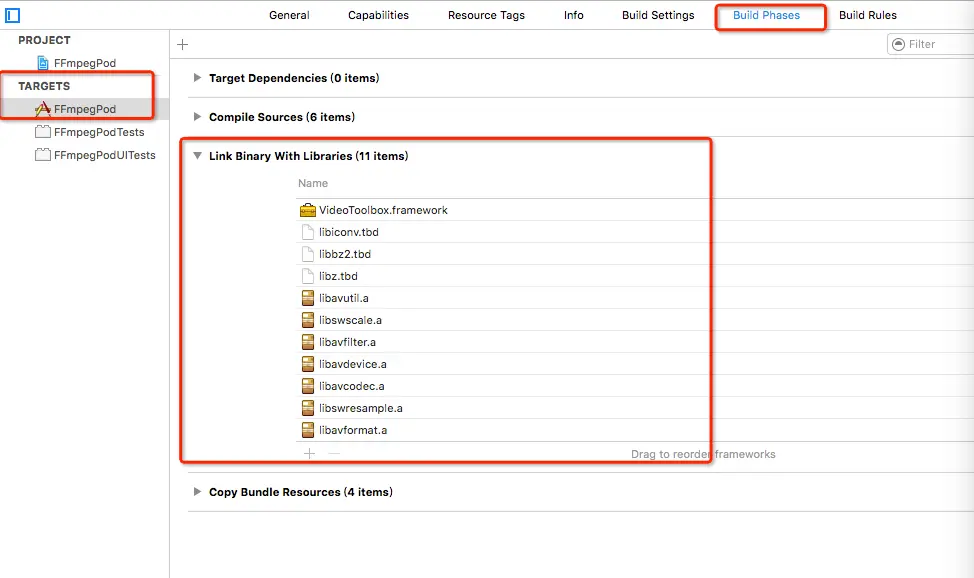 FFmpeg-iOS文件夹拖到目标工程并添加libz.dylib、libbz2.dylib、libiconv.dylib三个库,xcode7 及以上则是添加libz.tbd、libbz2.tbd、libiconv.tbd,并添加框架VideoToolbox.framework(此框架是 iOS8 新增的,用于硬解码) - 设置头文件路径