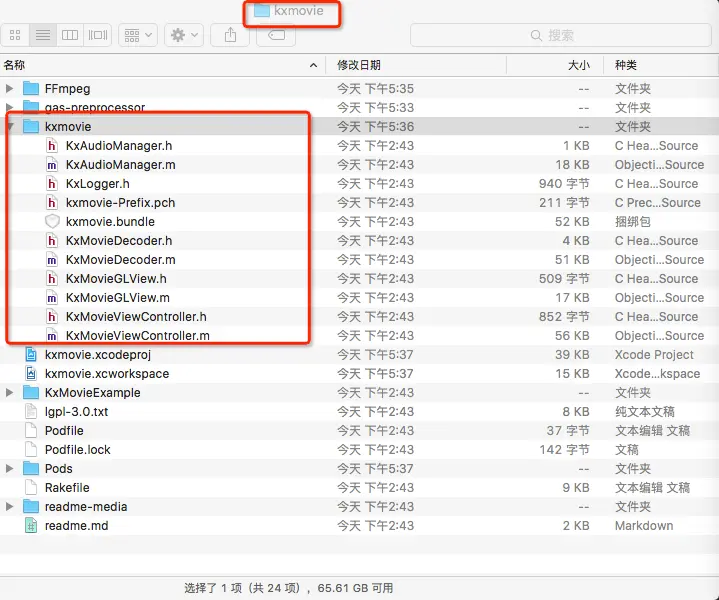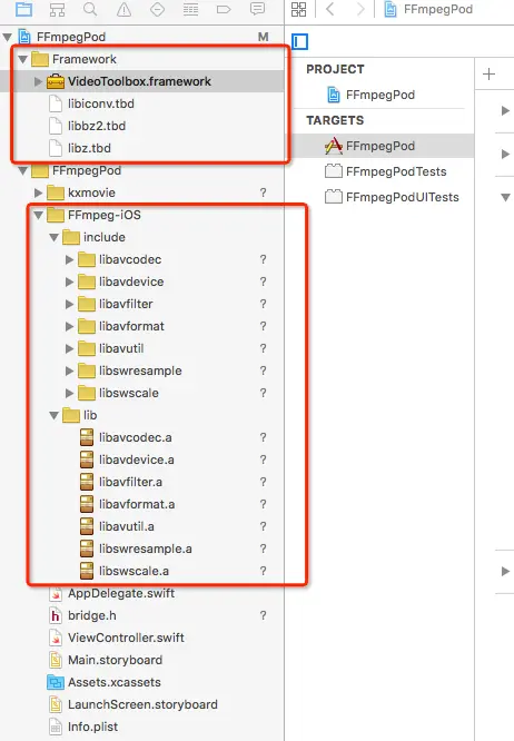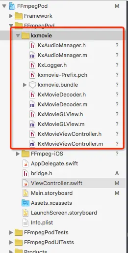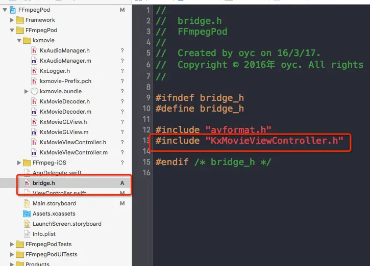kxmovie目录下的kxmovie文件夹拖到工程中 - 在桥接文件里添加要使用到的目标文件,如