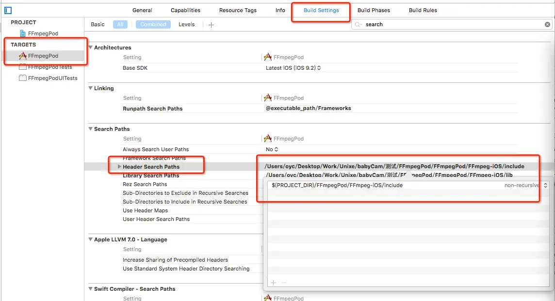 $(PROJECT_DIR)/$(PRODUCT_NAME)/FFmpeg-iOS/include: - OC 工程在调用的时候直接