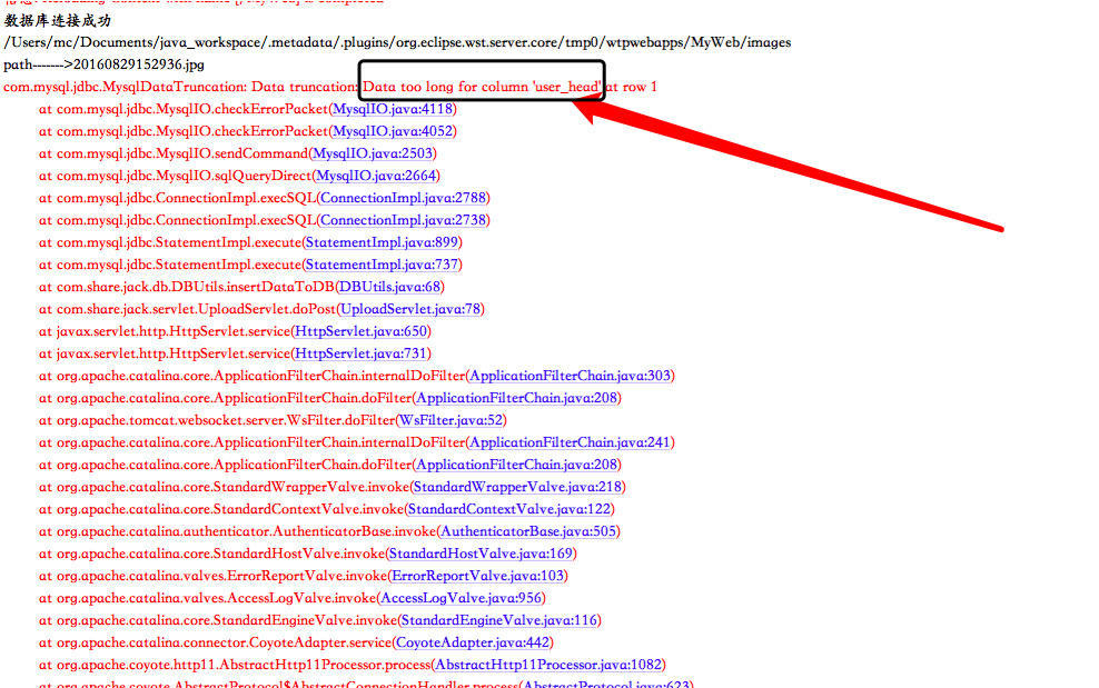 咦!!!怎么数据库中是空的呢???仔细想想,服务器中都有了,数据库中没有,那肯定存储的过程中发生了错误,好,去看看服务端,果然报错: