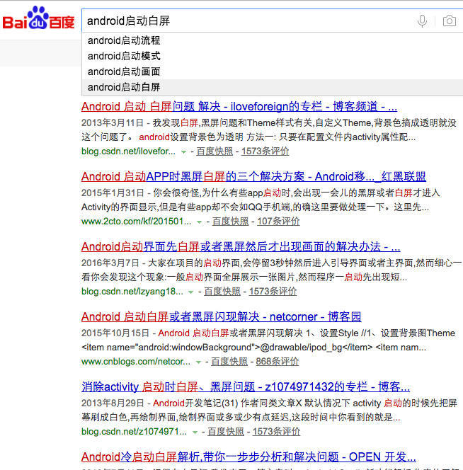 可能有人要问了,这不是挺好的一个欢迎界面吗?有啥问题,我相信看的仔细的看官会发现启动之后有一段时间是空白的,即使是很短,让人看着也不舒服,这时候可能又有人说了,那可能是你在application里面干了耗时的事才导致的,话说我一开始也是这样觉得的,然后我令写一个demo作测试,发现然而并不关你的application什么事儿,因为我都没有application,启动的时候依然有这样的问题,然后我就去对比我手机上腾讯公司和其他公司的产品,我发现他们的app大多是在你手指按下桌面图标的时候,先**"静止"**一段时间,然后再启动,而且中间一点白色的间隙也没有,这是什么鬼,带着疑惑,我去百度了一番,发现问题还真有: