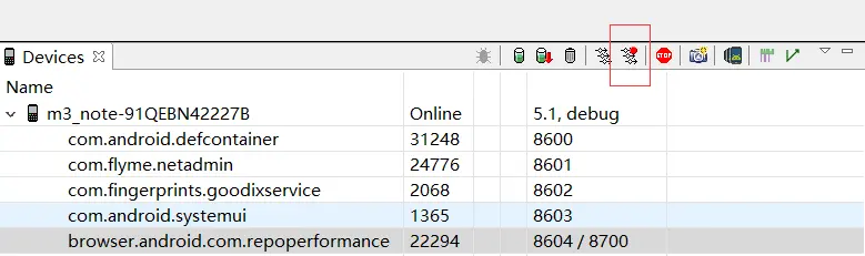 Android Studio中的Tools/Android/Android Device Monitor,打开调试界面。 - 第二步:如下面截图所示,选中要分析的应用包名,点击