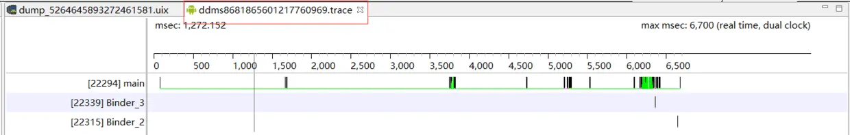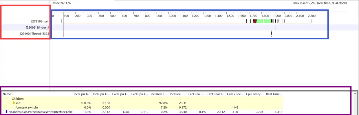 - 蓝色区域:线程在一段时间内的运行情况,我们点击有颜色的地方,就可以定位到具体做了哪些操作。