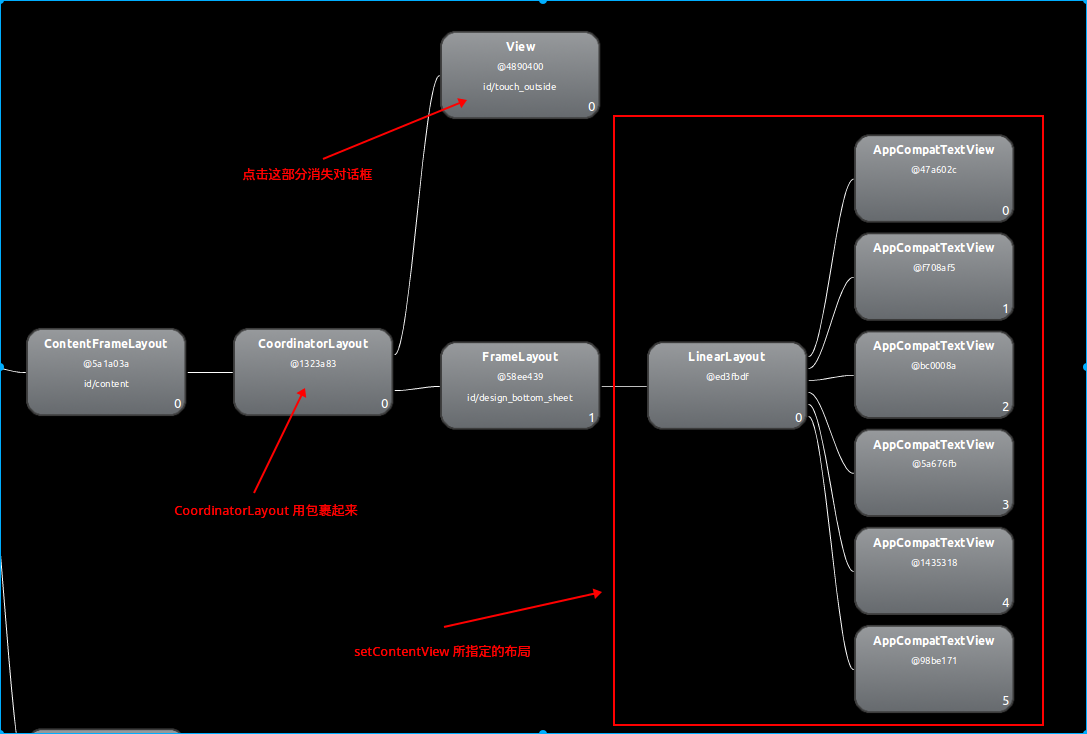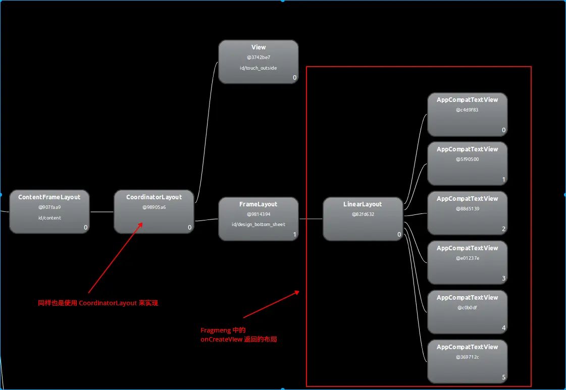 BottomSheetDialog继承于Dialog,当我们通过setContentView方法传入自定义布局的时候,它会将这个布局使用CoordinatorLayout包裹起来,所以当使用BottomSheetDialog的时候,底部菜单和根布局并不属于同一个window:
