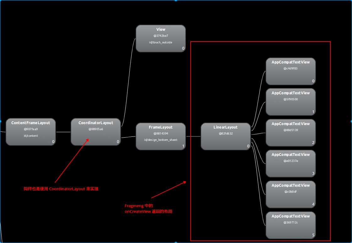 BottomSheet需要我们自己去声明CoordinatorLayout布局,并把底部菜单作为它的子View。BottomSheetDialog和BottomSheetDialogFragment,只需要我们提供一个底部菜单的布局,在它们内部的实现当中,它再把我们传入的布局放入到CoordinatorLayout当中,之后再把这一整个包装好的布局作为Dialog的布局。
