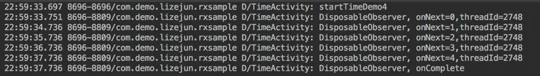 在3.3的例子中,我们的任务会无限执行下去,如果我们希望只执行指定次数该怎么办呢,其实在 RxJava2 实战知识梳理(5) - 简单及进阶的轮询操作 中演示固定时延的轮询操作时,我们已经介绍了使用intervalRange来实现,今天,我们采用interval + take的方式来实现,代码如下: