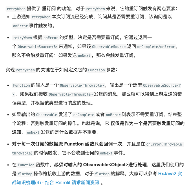 retryWhen进行重订阅,因为在获取到城市,之后转换成城市天气信息的时候有可能发生错误,如果发生了错误,那么整个调用链就结束了,需要重新订阅。这里的重订阅使用的retryWhen操作符,关于重订阅更详细的解释可以看前面的这篇文章 RxJava2 实战知识梳理(6) - 基于错误类型的重试请求,下面是其中的部分说明: