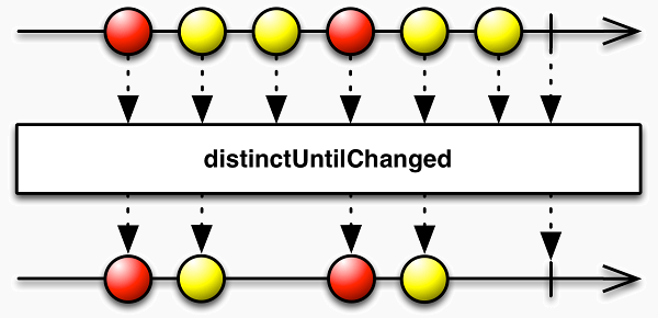 distinctUntilChanged对定位结果进行过滤,如果此次定位的结果和上次定位的结果相同,那么不通知订阅者。distinctUntilChanged的原理图如下所示:
