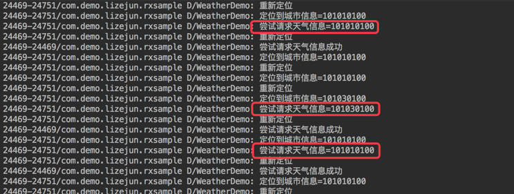 此时控制台的输出如下,可以看到在网络重连之后,我们使用缓存的城市自动重新发起了请求: