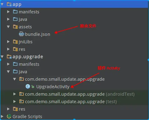 这里的步骤和 插件化知识梳理(1) - Small 框架之如何引入应用插件 相同,就是新建一个宿主模块app和一个应用插件模块app.upgrade,从宿主模块中可以跳转到应用插件模块的Activity,该Activity的布局如下: