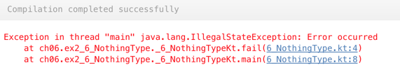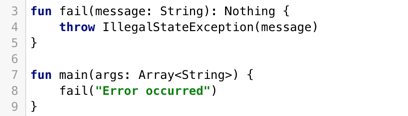 对于某些Kotlin函数来说,“返回类型”的概念没有任何意义,因为它们从来不会成功地结束,Kotlin使用一种特殊的返回类型Nothing来表示: